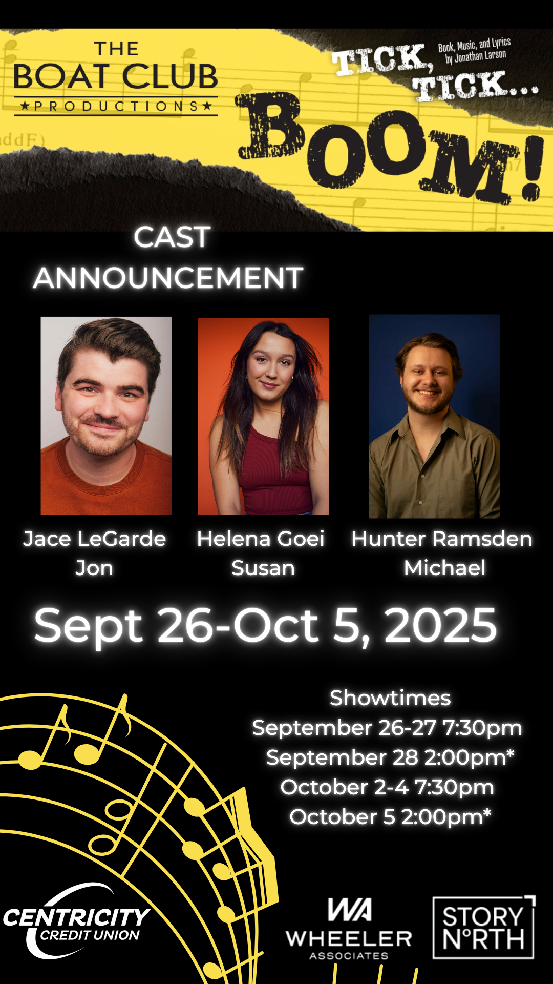 Everyone will love this youthful, endearing and thoughtful piece, and will surely embrace the universal ideal of holding onto your dreams through life’s most difficult challenges. Tick, Tick… Boom! features a three-person cast showcasing strong pop/rock singers and allowing performers to make creative character choices.”